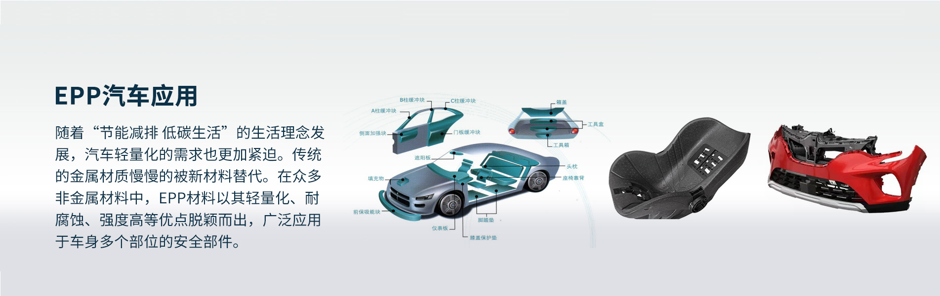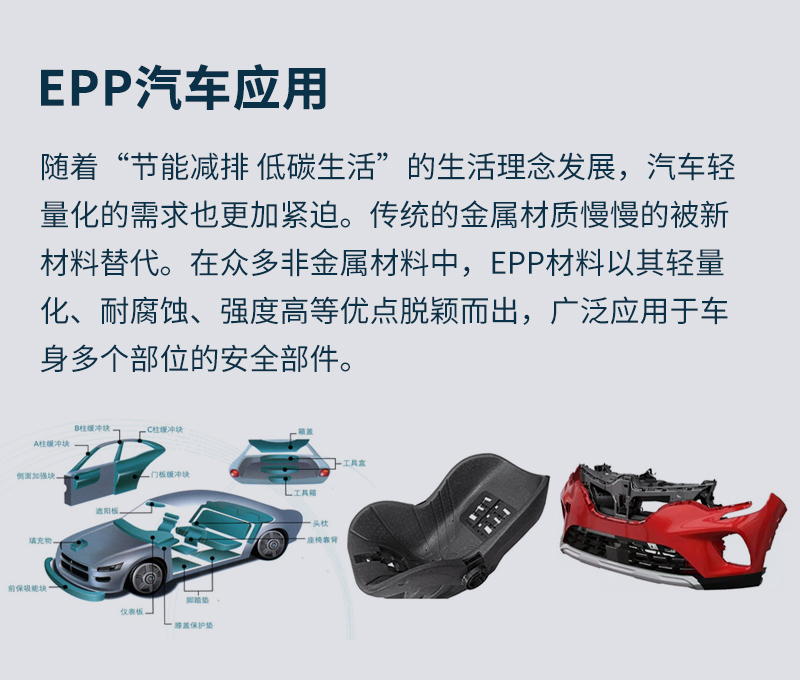 EPP材料的輕質(zhì)特性使其成為汽車(chē)制造領(lǐng)域的理想選擇。在汽車(chē)構(gòu)件中使用EPP可以降低車(chē)身重量,提高燃油效率,并減少碳排放量,有助于實(shí)現(xiàn)更環(huán)保的交通運(yùn)輸。